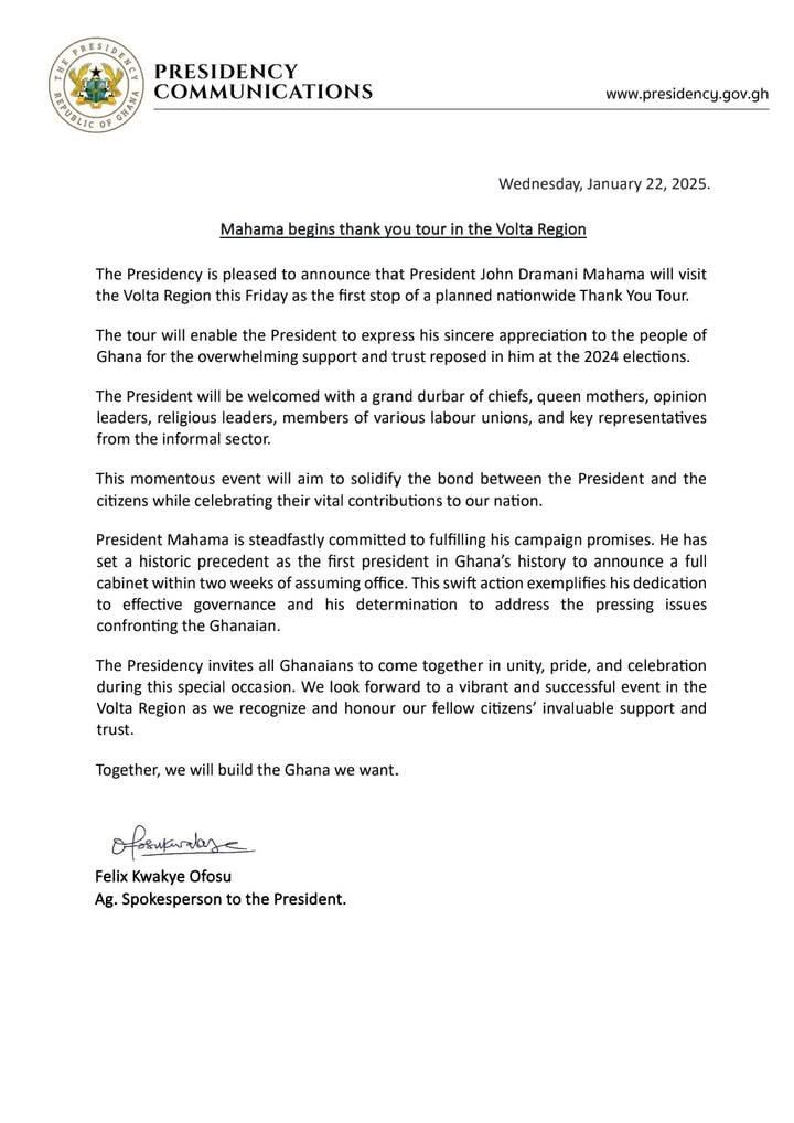 Posted inAnnouncement News President Mahama to Begin Thank You Tour in Volta Region January 22, 2025 Posted by myAdaklu.Online No Comments SharePresident John Dramani Mahama will officially start his Thank You Tour in the Volta Region this Friday, January 24, 2025. The event will take place at Jubilee Park, Ho, starting at exactly 12:00 PM.Share myAdaklu.Online myAdaklu.online View All Posts Post navigation Previous Post Parliament Approves Kwame Agbodza, Haruna Addrisu, Eric Opoku as MinistersNext PostAdaklu DCE Aspirants Scheduled For Vetting on Monday